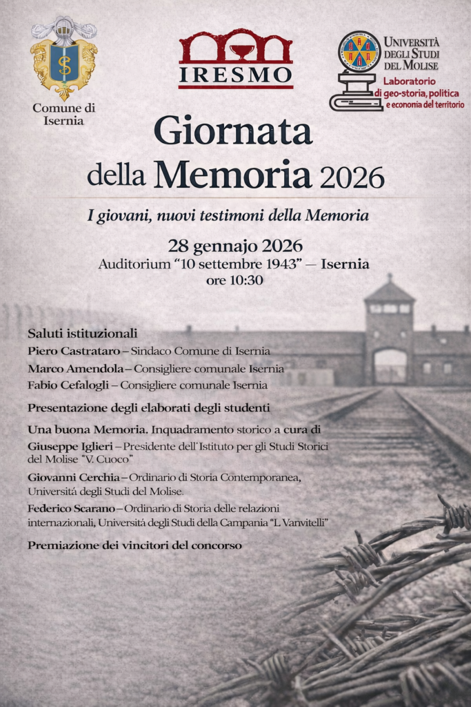 In occasione della Giornata della Memoria 2026, l’IRESMO, in collaborazione con il Comune di Isernia e l’Università degli Studi del Molise, promuove un seminario-convegno dal titolo “I giovani, nuovi testimoni della Memoria”.